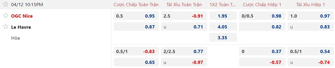 Sàn giao dịch châu Á ghi nhận mức kèo Nice chấp 1/2 trái, tỷ lệ mà đội bóng này tương đối có duyên, khi 2 trận sân nhà gần đây xuất hiện đều chứng kiến họ giành chiến thắng. Với Le Havre, 2 trận sân khách gần nhất được chấp 1/2 trái như trận này họ đều là những người nhận trái đắng.