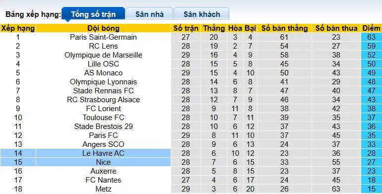 Thống kê phong độ, lịch sử đối đầu của Nice vs Le Havre