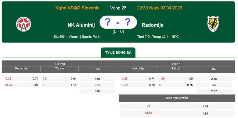 Nhận định, soi kèo NK Aluminij vs NK Radomlje, 22h30 ngày 3/4 – Giải vô địch Slovenia. Phân tích tỷ lệ kèo, dự đoán kết quả NK Aluminij đấu với NK Radomlje chuẩn xác từ các chuyên gia hàng đầu BongdaNET.