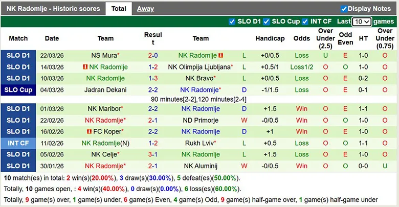 – Thống kê phong độ 10 trận đấu gần nhất của NK Radomlje