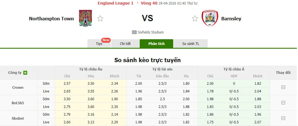 Nhận định soi kèo Northampton vs Barnsley, 01h45 ngày 29/4 tại hạng 2 Anh. Phân tích tỷ lệ kèo, dự đoán kết quả Northampton đấu với Barnsley từ tỷ lệ châu Âu, châu Á qua các chuyên gia hàng đầu.