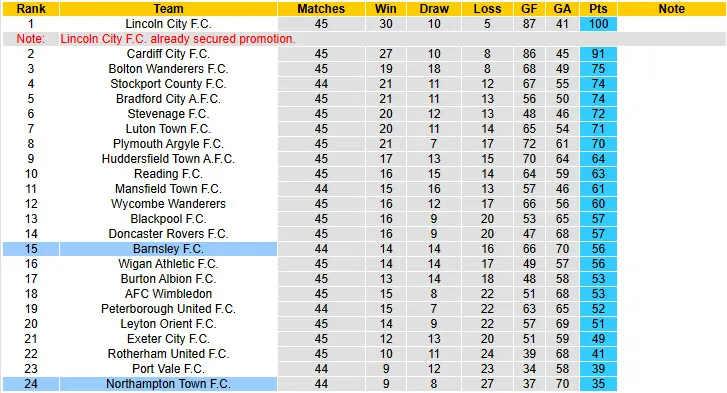 Đêm nay, dù thi đấu trên sân nhà song với phong độ hiện tại và tinh thần thi đấu đã hết, Northampton nhận một thất bại là kết quả dễ đoán. Chính xác hơn, đội quân của HLV Kevin Nolan còn nhận một thất bại với tỷ số cách biệt. Nhắc lại, Northampton vừa có mạch 3 trận đấu để thủng lưới ít nhất 2 bàn/trận. Tính từ đầu mùa giải tới giờ, họ là đội bóng có số bàn thua cao nhất giải với 70 bàn thua. Khá trùng hợp, đối thủ của Northampton ở trận đấu đêm nay là Barnsley. Được biết, Barnsley cũng để thủng lưới tới 70 bàn thua và cùng Northampton sở hữu hàng thủ nghèo nàn nhất giải. Qua đây, NHM không bất ngờ nếu Northampton và Barnsley là trận đấu có nhiều bàn thắng.