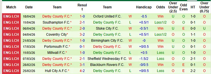 Thống kê phong độ 10 trận đấu gần nhất của Derby