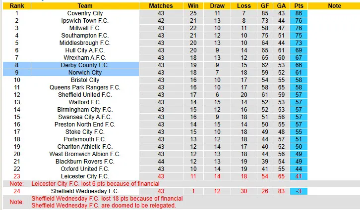 Thống kê phong độ, lịch sử đối đầu của Norwich vs Derby