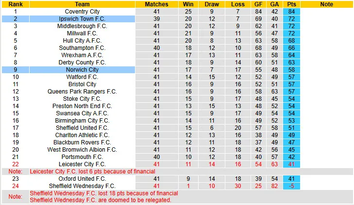 Được biết, đối thủ của Norwich là đội bóng đứng ở vị trí thứ 2 trên BXH Ipswich. Cho tới trước lượt trận tối nay, Ipswich tạm thời xếp ở vị trí thứ 2 với 72 điểm và chỉ hơn đội xếp thứ 3 (vị trí đá play off thăng hạng) đúng hiệu số bàn thắng thua. Dù vậy, Ipswich đang đá ít hơn nhóm bám đuổi phía sau tới 2 trận và họ vẫn là đội bóng chủ động trong cuộc đua tranh vị trí thứ 2 (vị trí có tấm vé thăng hạng trực tiếp). Ngay lúc này, Ipswich đang duy trì được sự tập trung khi bất bại 8 lượt trận mới đây tại giải hạng Nhất Anh. Với phong độ hiện tại, Ipswich không phải cái tên dễ để Norwich bắt nạt.