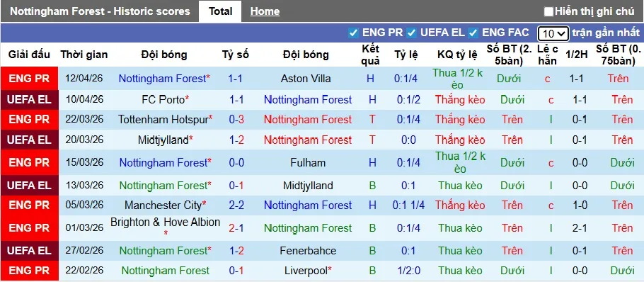 Thống kê phong độ 10 trận đấu gần nhất của Nottingham