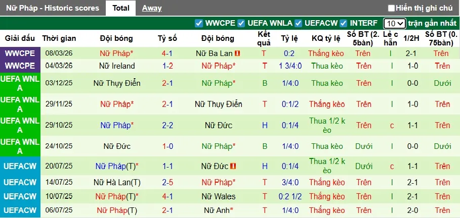 Thống kê phong độ 10 trận đấu gần nhất của Nữ Pháp
