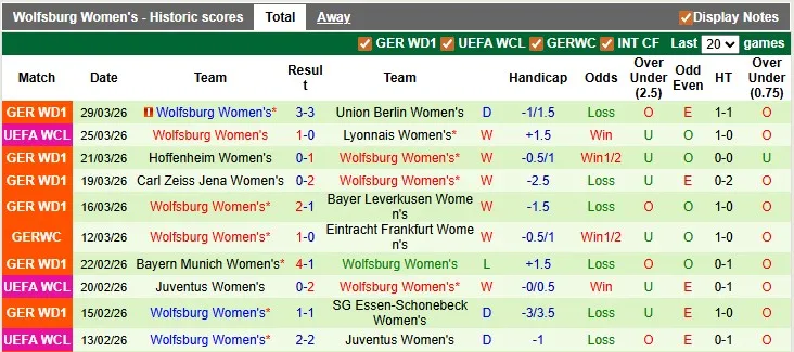 Thống kê phong độ 10 trận đấu gần nhất của nữ Wolfsburg