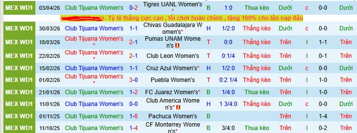 + 3/5 trận Nữ Tijuana tiếp đón Nữ Mazatlan trên sân nhà thậm chí chỉ có 2 bàn thắng trở xuống.