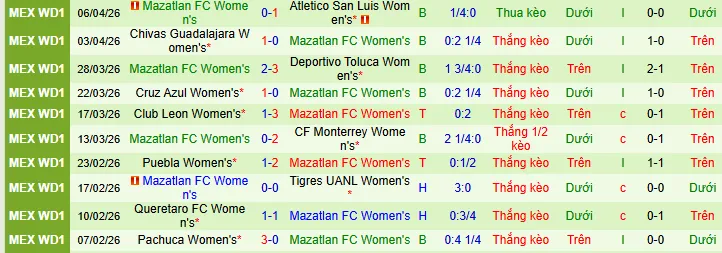+ Nữ Mazatlan cũng thắng 9 hòa 1 trong 10 trận mới nhất trên sân khách có mở kèo châu Á.