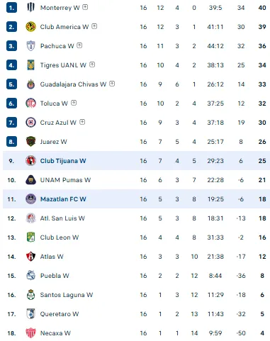Bảng xếp hạng giải VĐQG Nữ Mexico 2025/26