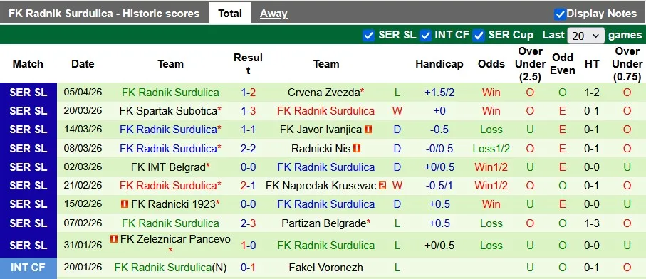 Thống kê phong độ 10 trận đấu gần nhất của Radnik Surdulica
