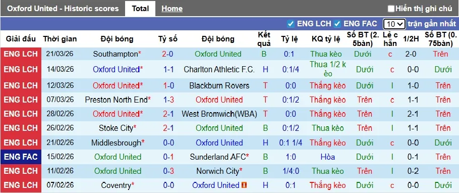 Thống kê phong độ 10 trận đấu gần nhất của Oxford United