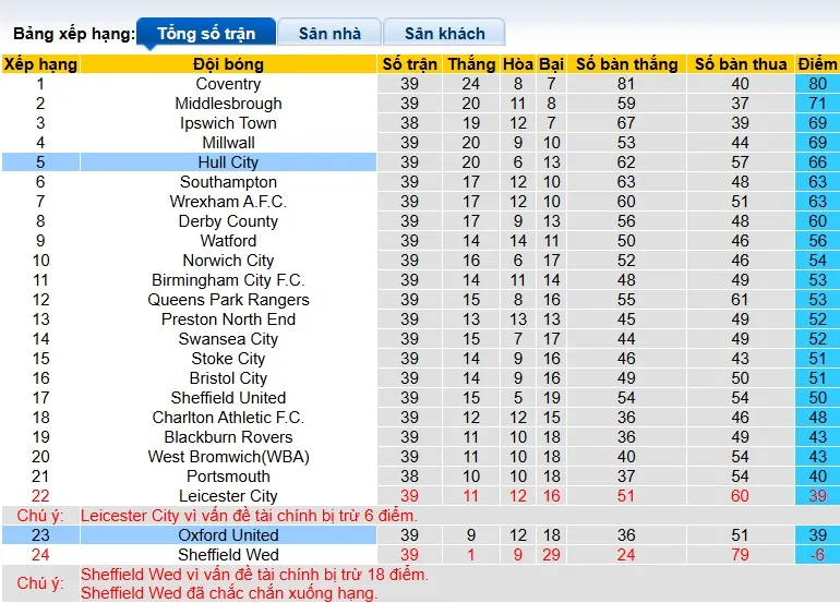 Thống kê phong độ 10 trận đấu gần nhất của Hull City
