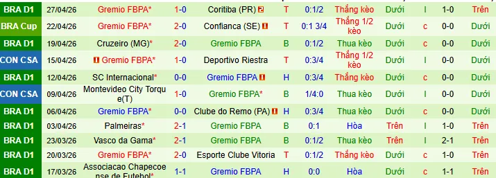 Thống kê phong độ 10 trận đấu gần nhất của Gremio FBPA