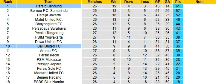 Nên nhớ, khác với PSBS Biak – đội bóng đứng cuối cùng trên BXH, đối thủ của Bali United ở trận đấu tối nay là đội bóng đứng đầu bảng Persib Bandung. Hiện tại, Persib Bandung đang là đội bóng đứng đầu bảng với 61 điểm và họ đang rất cần điểm để cạnh tranh ngôi vô địch. Nên biết, đối thủ cạnh tranh Borneo FC vừa có chiến thắng ở trận đấu sớm vòng 27 và thu hẹp khoảng cách với Persib Bandung xuống còn 1 điểm, Tất nhiên, Persib Bandung hiểu rõ áp lực từ đối thủ và họ bước vào trận đấu tối nay với 100% sự tập trung. Được biết, thầy trò HLV Bojan Hodak đang duy trì được phong độ chói sáng toàn thắng 14 trận sân nhà mới đây và thừa tự tin đánh bại Bali United.