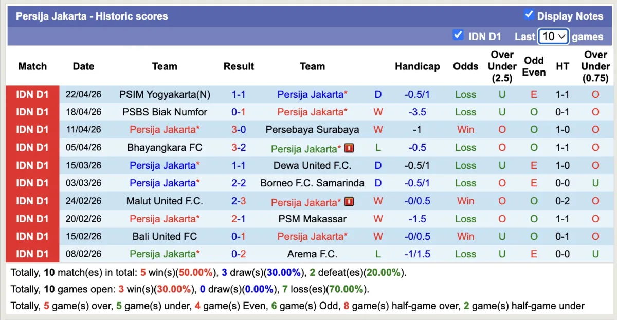 -Thống kê phong độ 10 trận đấu gần nhất của Persija Jakarta