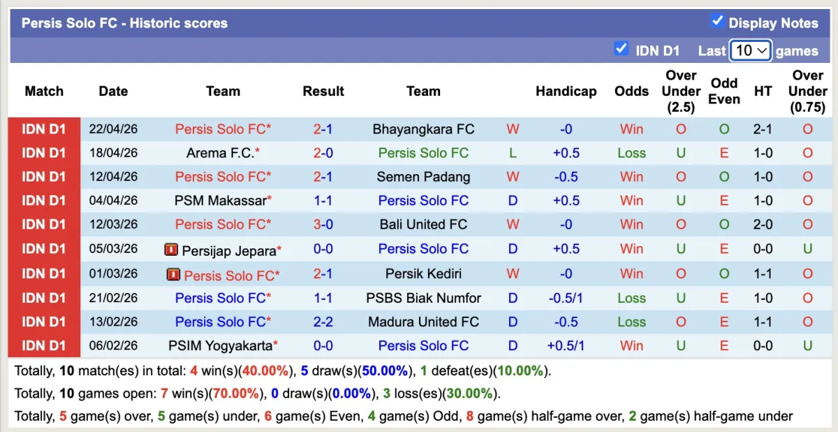 -Thống kê phong độ 10 trận đấu gần nhất của Persis Solo