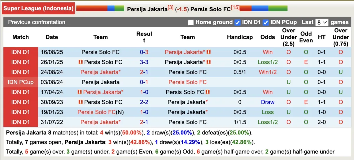 Không bất ngờ khi Persija Jakarta được đánh giá cao hơn, nhưng mức chấp quá cao đang khiến đội bóng này bị nghi ngờ khi đặt niềm tin bởi 5/6 vòng đấu gần nhất họ đều thua kèo. Trong khi đó 6/7 trận gần đây Persis Solo đều thắng kèo.