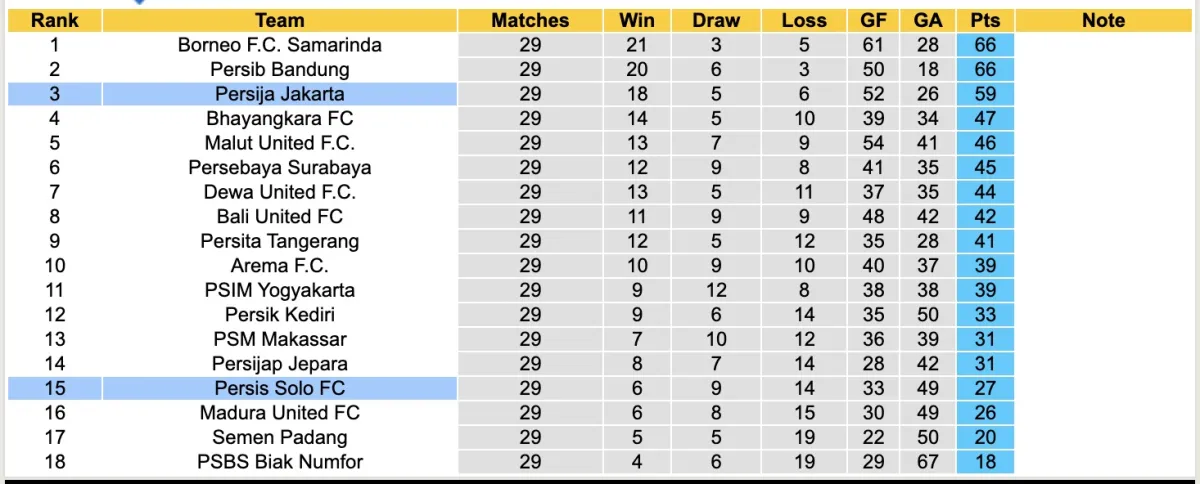 Persija Jakarta hiện tại đang đứng thứ 3 với 59 điểm sau 29 vòng đấu. Đội bóng này đang chỉ kém Top2 7 điểm. Mặt khách đội dẫn đầu và đứng thứ 2 đang bằng điểm nhau. Đội chủ nhà cũng vững vàng ở nhóm AFC Challenge League.