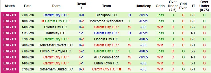 Thống kê phong độ 10 trận đấu gần nhất của Cardiff City
