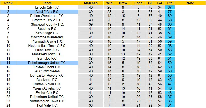 Peterborough bất bại cả 6 trận đấu vừa rồi tiếp đón Cardiff City trên sân nhà. Peterborough bất bại tới 4/6 trận đấu vừa qua và trong đó có tới 3 trận đấu chia điểm. Cardiff City chỉ có được 1 điểm ở trận đấu gần nhất tại giải hạng 2 Anh.