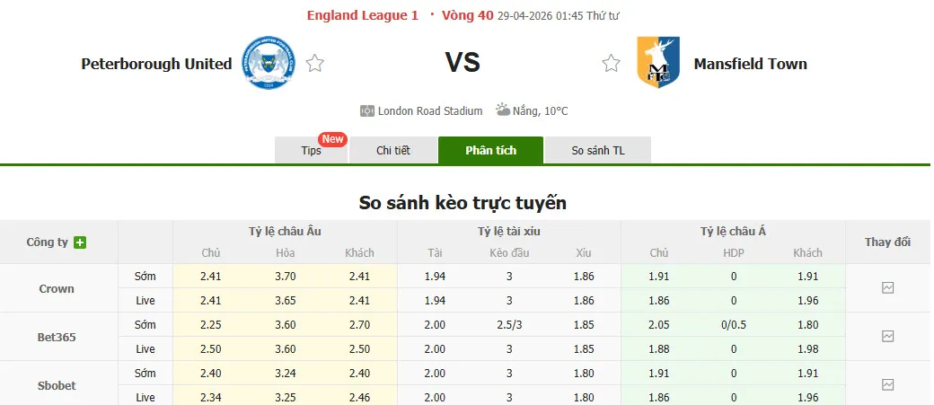 Nhận định soi kèo Peterborough vs Mansfield Town, 01h45 ngày 29/4 tại hạng 2 Anh. Phân tích tỷ lệ kèo, dự đoán kết quả Peterborough đấu với Mansfield Town từ tỷ lệ châu Âu, châu Á qua các chuyên gia hàng đầu.