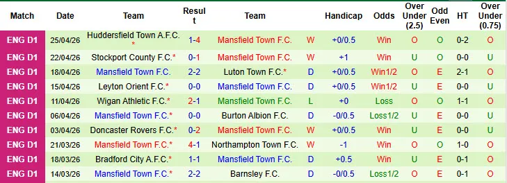 Thống kê phong độ 10 trận đấu gần nhất của Mansfield Town