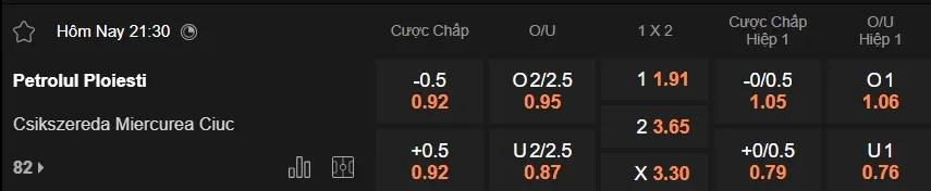 Sàn giao dịch châu Á ghi nhận mức kèo Petrolul Ploiesti chấp 1/2 trái, tỷ lệ đã xuất hiện ở trận đối đầu gần nhất hồi đầu tháng 3, khi họ bị Miercurea cầm hòa với tỷ số 1-1 trên sân nhà. 2 trận thua gần đây cũng đều chứng kiến Petrolul Ploiesti chấp dao động từ 1/4 đến 1/2 trái. Trong khi đó, Miercurea bước vào trận đấu đêm nay với thành tích thắng kèo 4, hòa 1 trong 5 trận gần nhất.