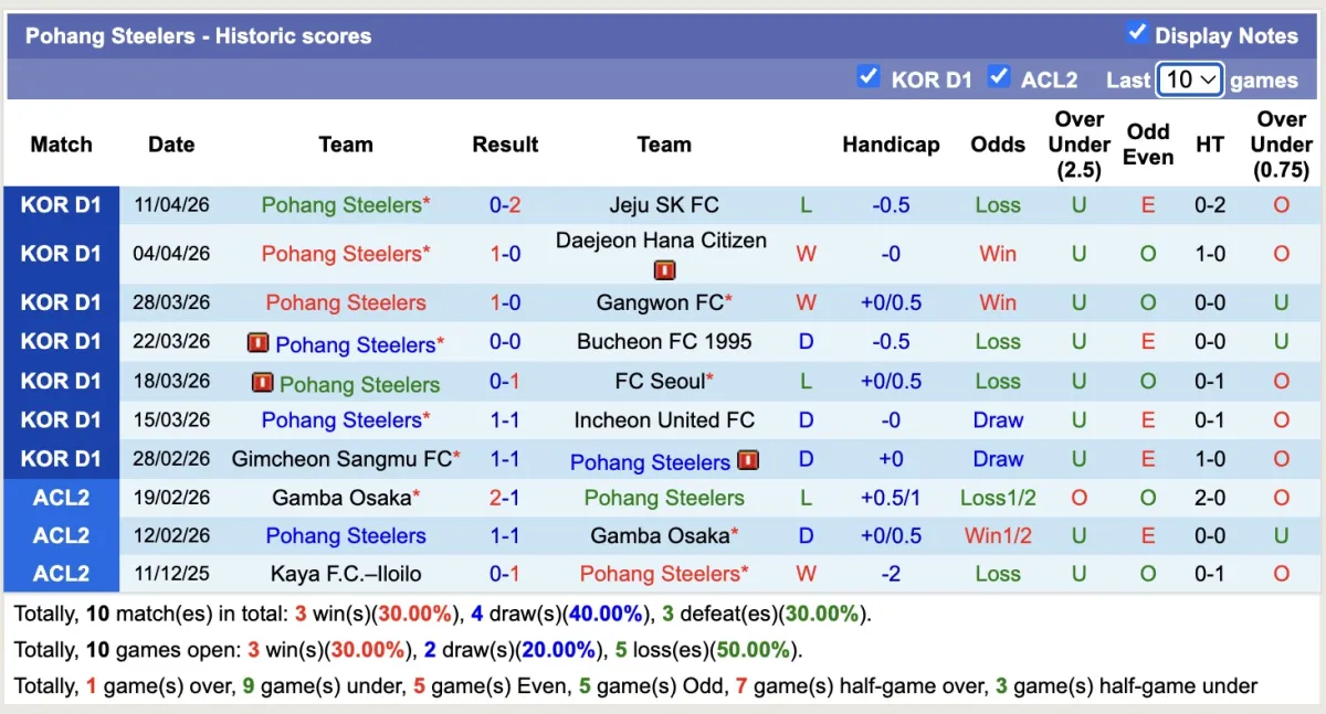 -Thống kê phong độ 10 trận đấu gần nhất của Pohang Steelers