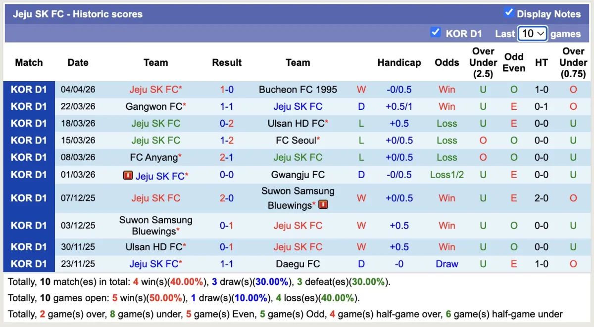 -Thống kê phong độ 10 trận đấu gần nhất của Jeju SK