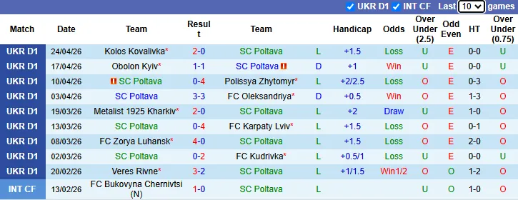 Thống kê phong độ 10 trận gần nhất của Poltava