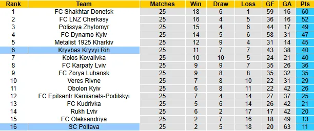 Thống kê phong độ, lịch sử đối đầu Poltava vs Kryvbas Kryvyi Rih