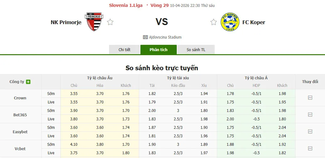 Nhận định soi kèo Primorje vs Koper, 22h30 ngày 10/4 tại VĐQG Slovenia. Phân tích tỷ lệ kèo, dự đoán kết quả Primorje đấu với Koper từ tỷ lệ châu Âu, châu Á qua các chuyên gia hàng đầu.