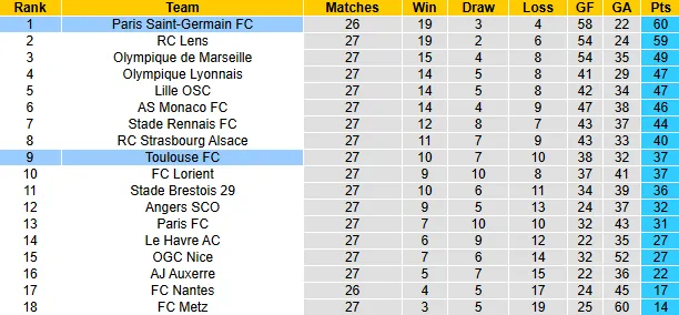 Phía đối diện, Toulouse đang có một mùa giải khá yên ổn ở vị trí thứ 9/18 với 37 điểm. Đội khách gần như đã trụ hạng thành công và cũng khó có cửa cạnh tranh vé dự cúp châu Âu. Phong độ gần đây của Toulouse khá phập phù (thắng 2, hòa 2, thua 2 trong 6 trận gần nhất). Hàng thủ của họ vẫn thường gặp rất nhiều khó khăn trước các đội bóng có cường độ tấn công cao.