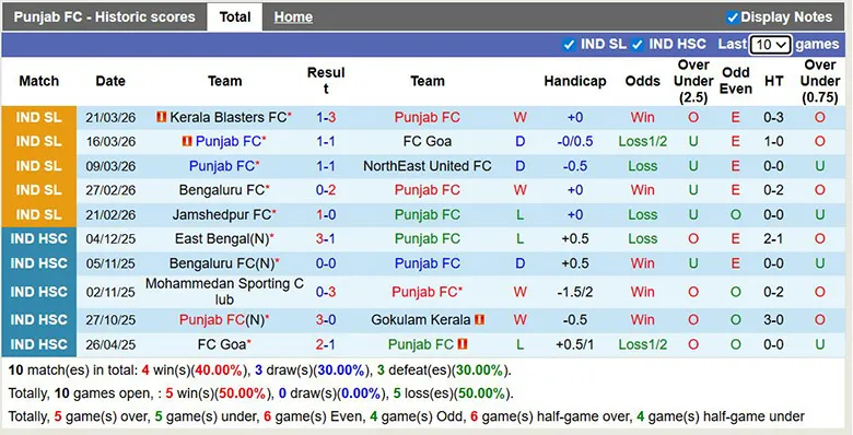 – Thống kê phong độ 10 trận đấu gần nhất của Punjab