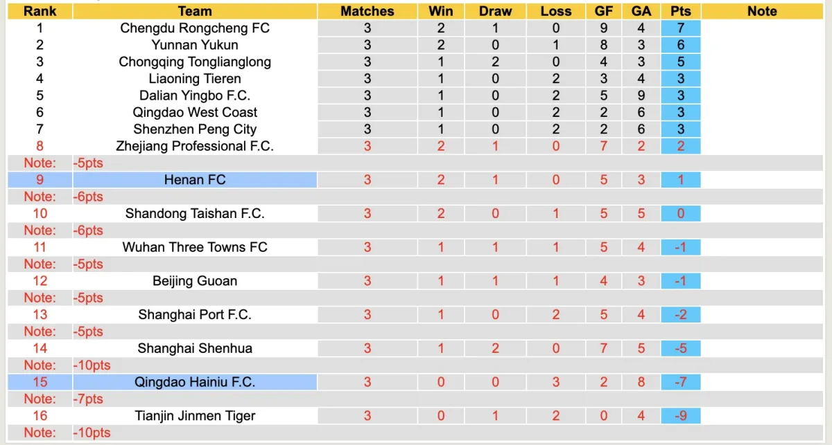 Trong 9 câu lạc bộ ở giải VĐQG Trung Quốc bị phạt có Qingdao Hainiu và Henan. Đội chủ nhà bị trừ 7 điểm, đội khách bị trừ 6 điểm. Qingdao Hainiu có lẽ đang đối mặt với vấn đề về tâm lý khi 3 vòng đấu đầu tiên đội bóng này đều thua.