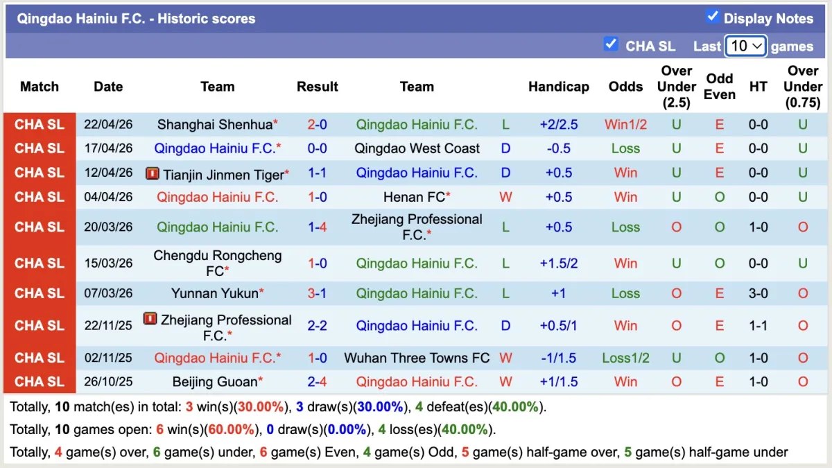 -Thống kê phong độ 10 trận đấu gần nhất của Qingdao Hainiu