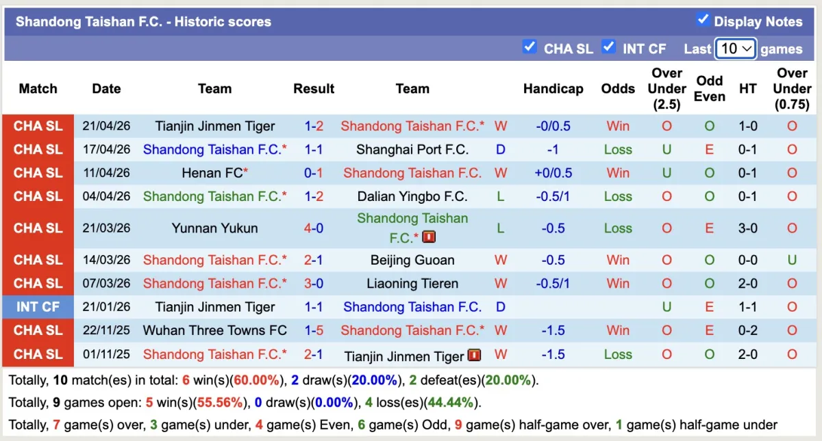 -Thống kê phong độ 10 trận đấu gần nhất của Shandong Taishan