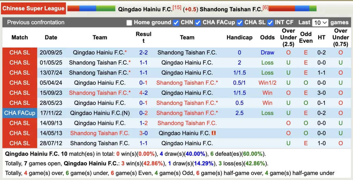 Thống kê phong độ, lịch sử đối đầu của Qingdao Hainiu với Shandong Taishan