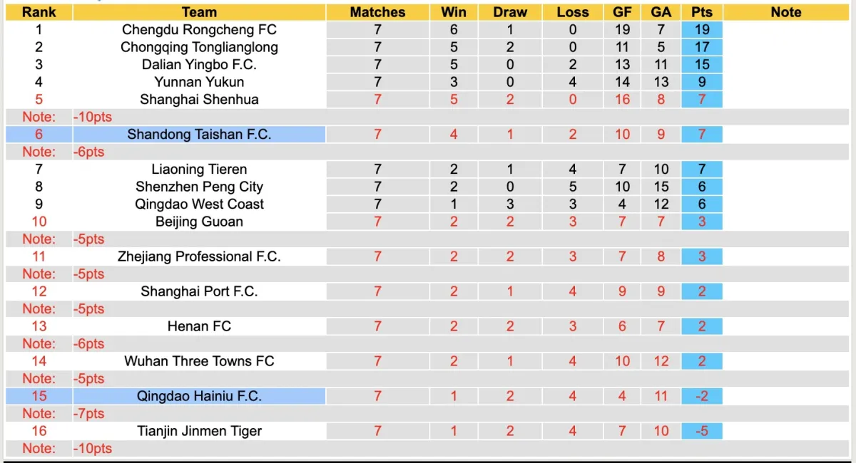 Shandong Taishan là một hai câu lạc bộ bị phạt ở mùa giải năm nay khi bị trừ 6 điểm. Tuy vậy đội bóng này đang thi đấu cố gắng với tinh thần khá ổn định khi 7 vòng đấu đã qua có đến 5 trận bất bại trong đó có đến 4 lần giành chiến thắng.