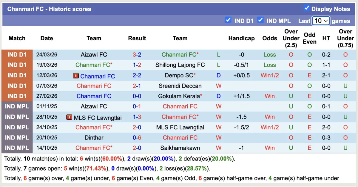 -Thống kê phong độ 10 trận đấu gần nhất của Chanmari