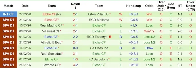 Elche đã có một màn trình diễn khá thất vọng trong 10 trận đấu gần đây với chỉ 2 chiến thắng, 2 trận hòa và tới 6 thất bại. Tuy nhiên, tia hy vọng đã lóe lên khi họ bất ngờ giành được 2 chiến thắng liên tiếp gần đây, bao gồm trận thắng 2-1 trước Mallorca tại LaLiga và 2-1 trước Aston Villa trong một trận giao hữu. Những kết quả này đã giúp Elche tạm thời thoát khỏi nhóm xuống hạng và mang lại một cú hích tinh thần cực lớn. Dù vậy, thành tích sân khách của Elche vẫn là một nỗi lo lớn khi họ chưa giành được bất kỳ chiến thắng nào sau 14 trận xa nhà tại LaLiga mùa này, chỉ kiếm được vỏn vẹn 4 điểm. Rafa Mir, với 8 bàn thắng, là chân sút chủ lực của Elche và sẽ là niềm hy vọng lớn nhất trên hàng công.