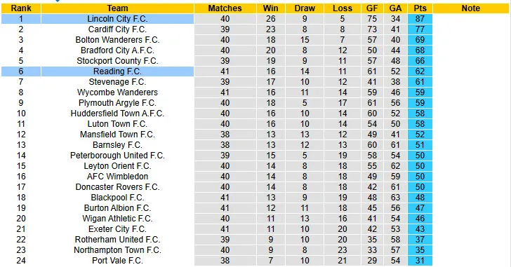 Reading và Lincoln City được xem là trận đấu tâm điểm của vòng 42 giải hạng 2 Anh 2025/26 khi cả hai đang có phong độ ổn định, và nằm trong nhóm đầu bảng tổng sắp. Trong đó, Lincoln City đang là đội bóng một mình một ngựa trong cuộc đua vô địch giải hạng 2 Anh. Chi tiết, họ đứng đầu bảng tổng sắp với 87 điểm và hơn đội xếp thứ 2 Cardiff City tới 10 điểm. Về phần đối thủ, Reading đứng ở vị trí thứ 6 trên BXH và đây là vị trí cuối cùng được đá play off thăng hạng. Dù vậy, họ vẫn cần thận trọng khi chỉ hơn đội xếp thứ 7 đúng 1 điểm nhưng Reading đã đá nhiều hơn đối thủ cạnh tranh top 6 tới 2 trận.