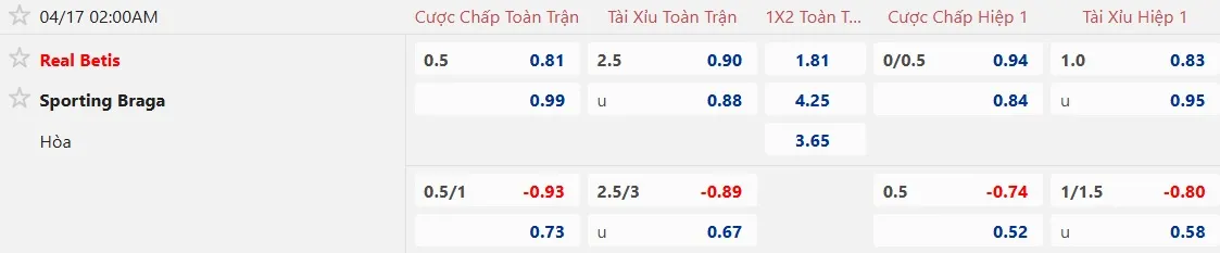 Real Betis đang có điểm rơi phong độ khá ổn định theo kèo châu Á với 2 trận liên tiếp gần đây thắng kèo. Đội bóng Tây Ban Nha cũng toàn thắng kèo 2 trận vừa qua tại đấu trường Europa League. Với Braga, đội khách không thắng kèo châu Á 4 trận liên tiếp, trong đó để thua kèo 3 trận.