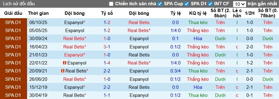 Các cầu thủ Espanyol bước vào trận đấu này với thành tích thua kèo châu Á 10, hòa 1 và chỉ thắng 1 trong 12 trận đấu gần đây trên mọi đấu trường. Lịch sử đối đầu cũng chứng kiến đội khách khiến các nhà đầu tư ôm hận ở cả 3 lần gần nhất chạm trán Real Betis.