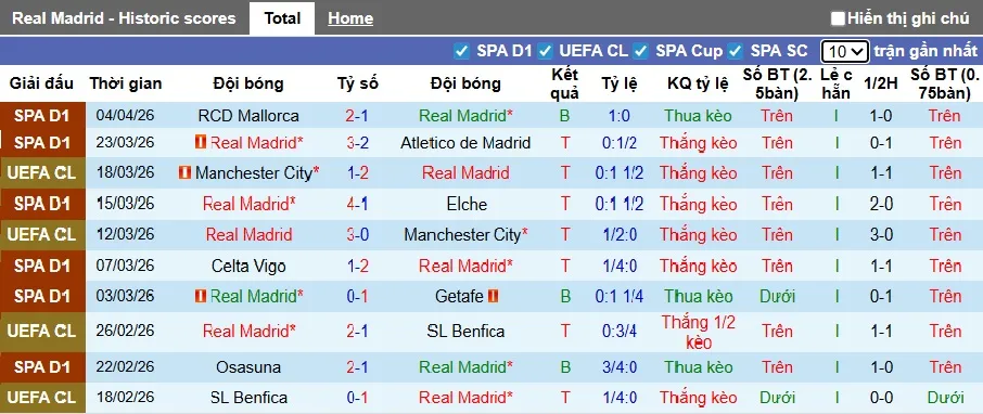 Thống kê phong độ 10 trận đấu gần nhất của Real Madrid