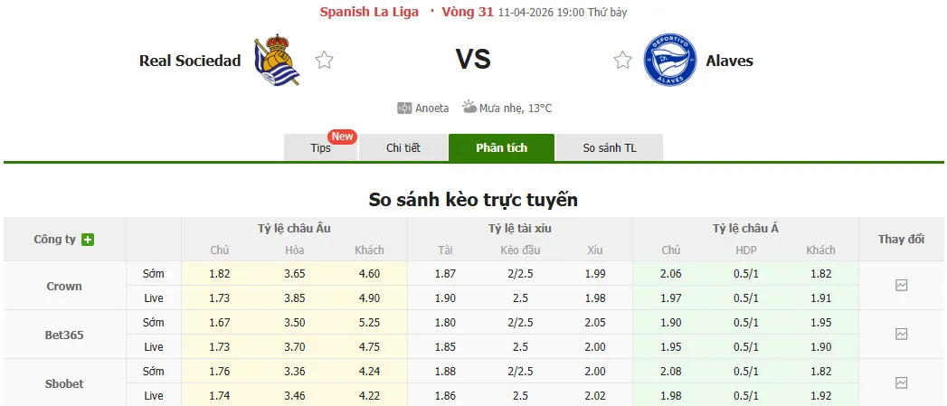 Nhận định soi kèo Real Sociedad vs Alaves, 19h00 ngày 11/4 tại VĐQG Tây Ban Nha. Phân tích tỷ lệ kèo, dự đoán kết quả Real Sociedad đấu với Alaves từ tỷ lệ châu Âu, châu Á qua các chuyên gia hàng đầu.