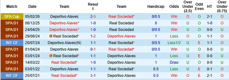 Real Sociedad là đội bóng có niềm vui thắng kèo ở trận đấu vừa rồi chạm mặt Alaves. Real Sociedad thắng kèo tới 4/6 trận đấu gần nhất. Alaves không thắng kèo tới 4/6 trận đấu mới đây tại giải VĐQG.