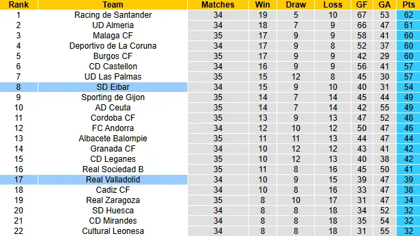 Trong vòng 7 trận gần đây tại Segunda, Eibar đánh bại đối thủ 6 lần. Trong khi đó Valladolid để thua 3/4 trận gần nhất. Trong 10 trận đối đầu gần đây giữa hai đội, chỉ 1 trận khép lại với tỷ số hoà.